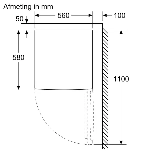 Diepte met 90° geopende deur1100 mm